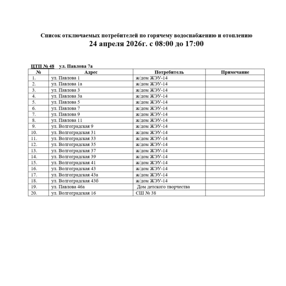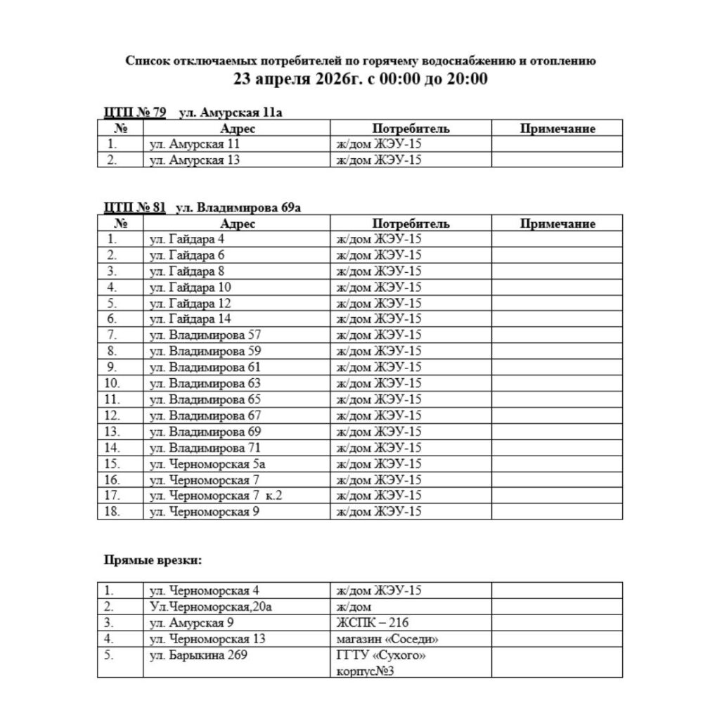 23 и 24 апреля в связи с необходимостью проведения ремонтных работ по объектам «Реконструкция тепловой сети между ТК24-19 и ТК24-22 поул. Гайдара- ул. Барыкина в г. Гомеле» и «Капитальный ремонт тепловой сети от ТК21-18 до ЦТП №48 по ул. Владимирова в г.Гомеле», направленных на повышение надежности и долговечности тепловых сетей, будет временно приостановлена подача тепловой энергии потребителям части Советского района г. Гомеля (список прилагается ).
