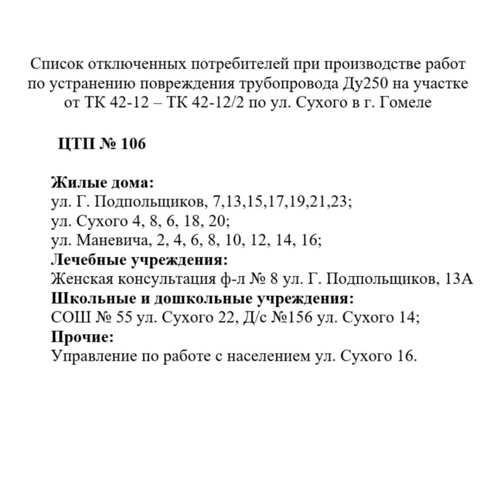 4 марта 2026 с 8:00 до 20:00 будет отключено отопление и горячее водоснабжение у потребителей части Железнодорожного района г. Гомеля (список прилагается) для производства работ по устранению повреждения трубопровода Ду250 на участке от ТК42-12 до ТК42-12/2 по ул. Сухого в г. Гомеле.