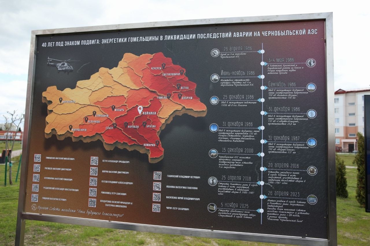 В Хойниках память о подвиге обрела зримый облик. В 2016 году здесь установили закладной камень, в 2018 году открыли Памятный знак, а в 2025 году состоялось торжественное открытие обновлённого сквера «Энергетиков». Это место стало символом неразрывной связи поколений, данью уважения героям-ликвидаторам и подарком жителям Хойников от энергетиков Гомельщины.