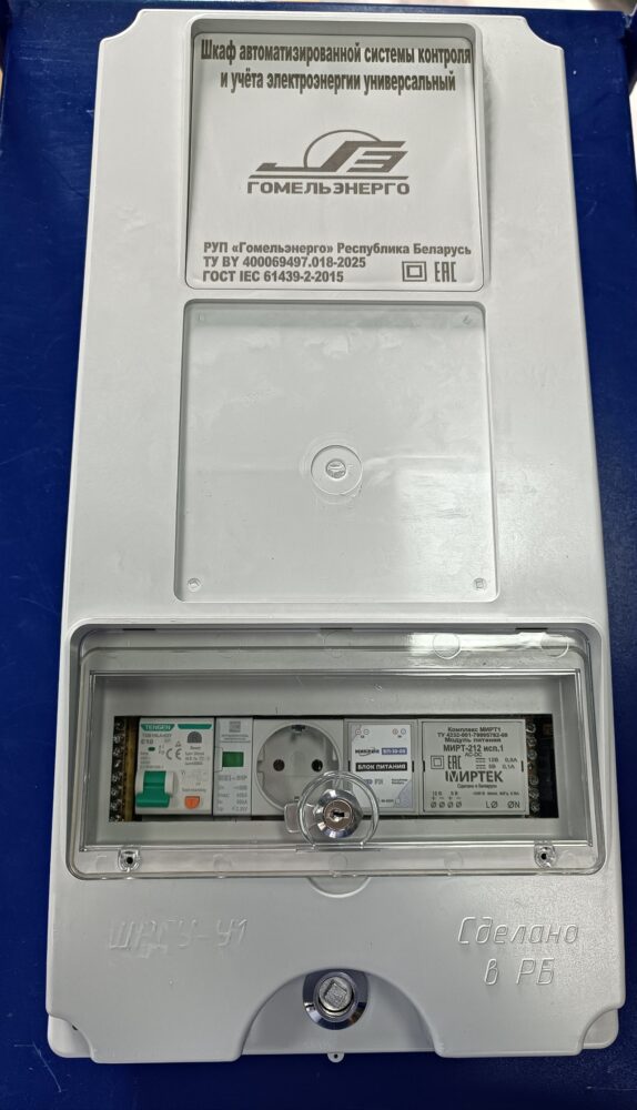 Шкаф АСКУЭ успешно прошел испытания в лабораториях Республики Беларусь на соответствие требованиям ТУ BY400069497.018-2025 «Шкаф автоматизированной системы контроля учета электроэнергии универсальный». Шкаф соответствует требованиям технических регламентов Таможенного союза «О безопасности низковольтного оборудования» (ТР ТС 004/2011), «Электромагнитная совместимость технических средств»(ТР ТС 020/2011), что подтверждено сертификатом.
